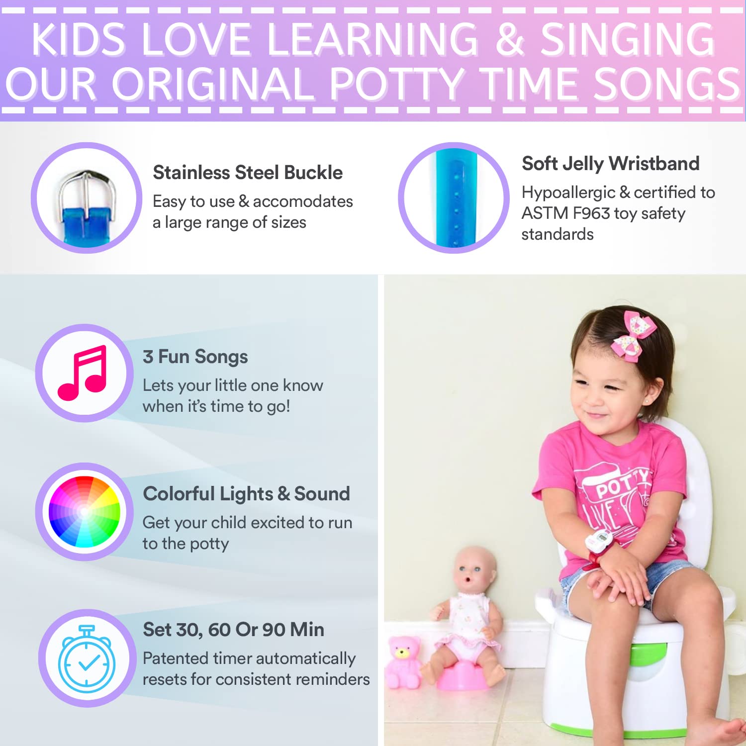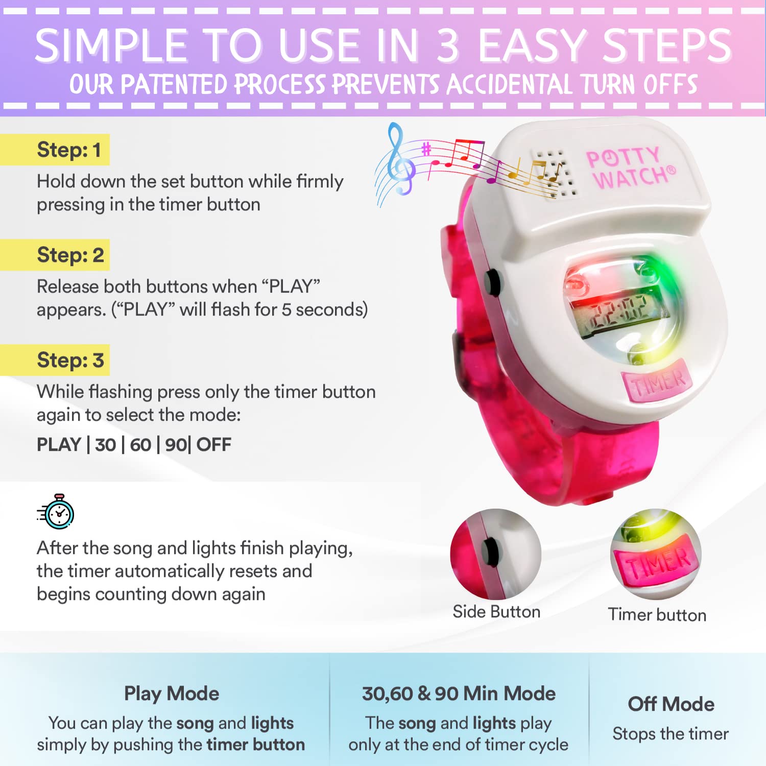 Potty Time's Potty Watch offers a fun and engaging way to encourage successful potty training! Each Potty Watch features a playful design that kids will love to wear. More than just a watch, it's a gentle reminder system that can be set to specific intervals, using a combination of sounds, music, and vibrations to cue little ones that it's "potty time." This visual and auditory reinforcement helps establish a routine and builds confidence, making the potty-training journey a more positive experience for both child and parent.