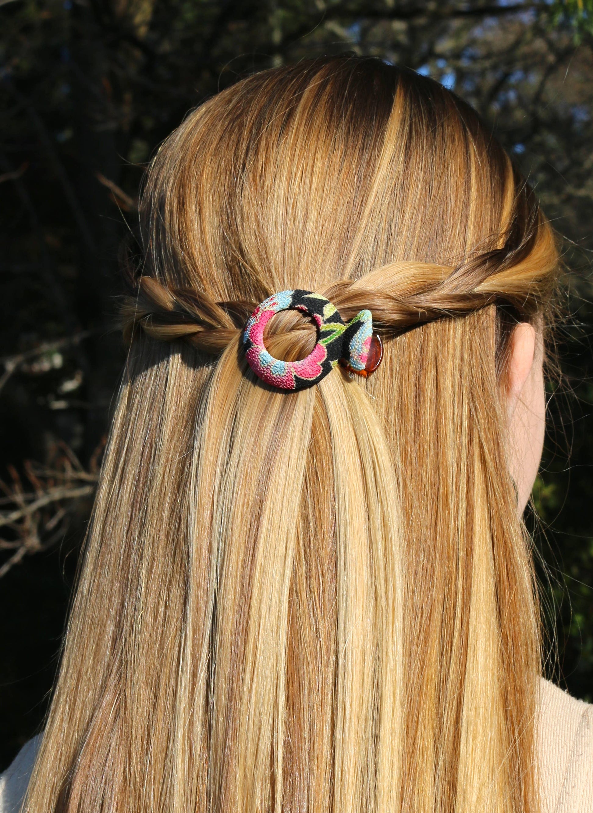 1.5" x 2" a small unique shape for bangs or partial pull back. Floral clips come in assorted patterns and colors. We will curate a balanced selection of colors and patterns for your order
