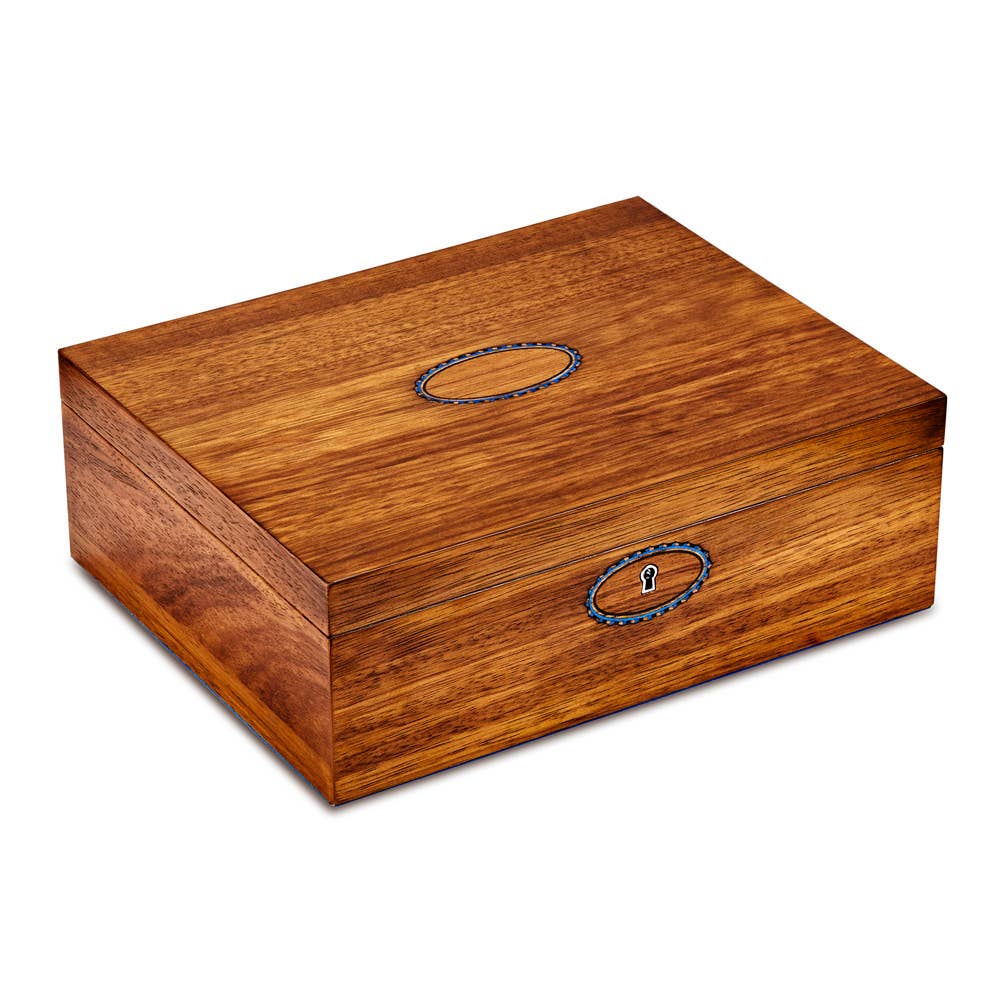 Inside the grand theatre inspired design features jewelry storage compartments with WOLF’s LusterLoc™ treated Ultrasuede lining in midnight blue. The custom scallop edged mirror is surrounded by a Swan Lake embroidered design depicting trees and a lake silhouette designed by Fiona Howard.