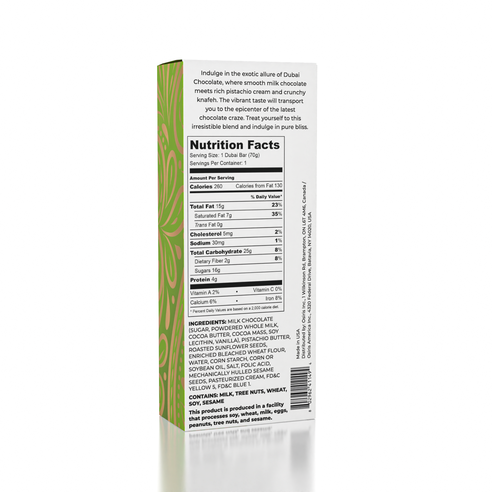 Get ready to experience the chocolate bar that's taken the internet by storm! Introducing the Oasis Treasures Knafeh Pistachio Dubai Chocolate Bar – the viral sensation you absolutely need to try. Each luxurious 2.45oz bar is a masterpiece, handcrafted right here in the USA, featuring a decadent blend of rich milk chocolate, creamy pistachio-infused white chocolate, and an irresistible, crunchy knafeh center that delivers an explosion of flavor and texture with every bite. Join over 1.4 million delighted customers who have already discovered this extraordinary treat from North America's largest wholesaler of Dubai Chocolate. Don't just eat chocolate, experience a phenomenon!