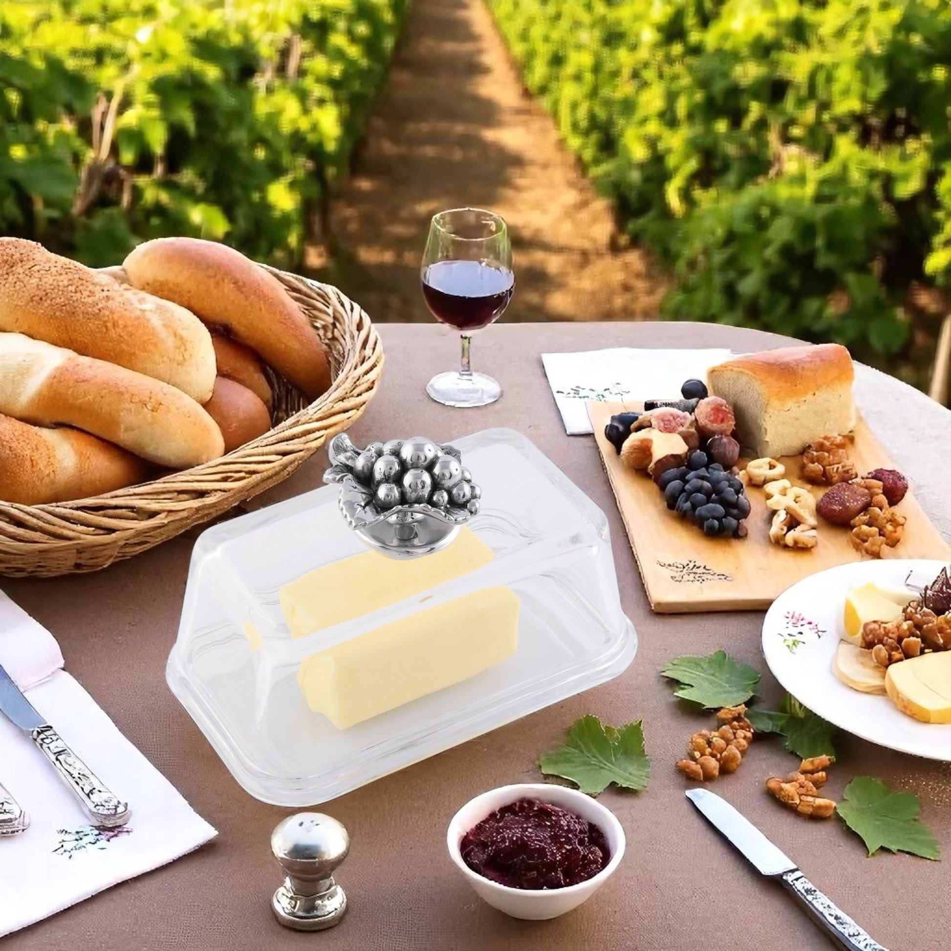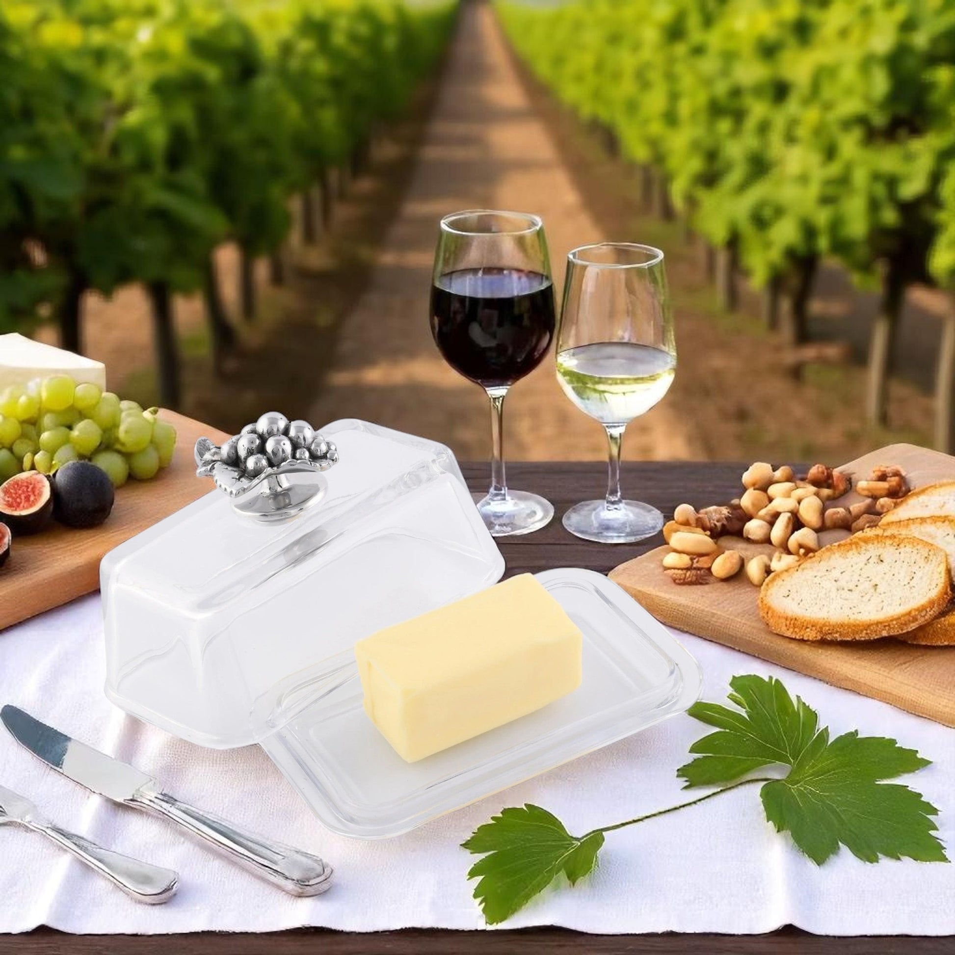 Introducing the exquisite, Aluminum and Glass Grape Butter Dish - a high-end gift for weddings and a magnificent addition to any dining set. Its elegant grape design makes it a beautiful hosting accessory, crafted intricively by artisans. Every detail of the grape accent on this butter dish attests to its high-quality craftsmanship and style. Its dimensions are designed to comfortably hold and showcase butter, adding a luxurious touch to your table. This Artisan Crafted Glass Butter Dish with Grape Accent is not only an ideal choice for elegant gifting but also offers a tasteful hint of sophistication for any meal.