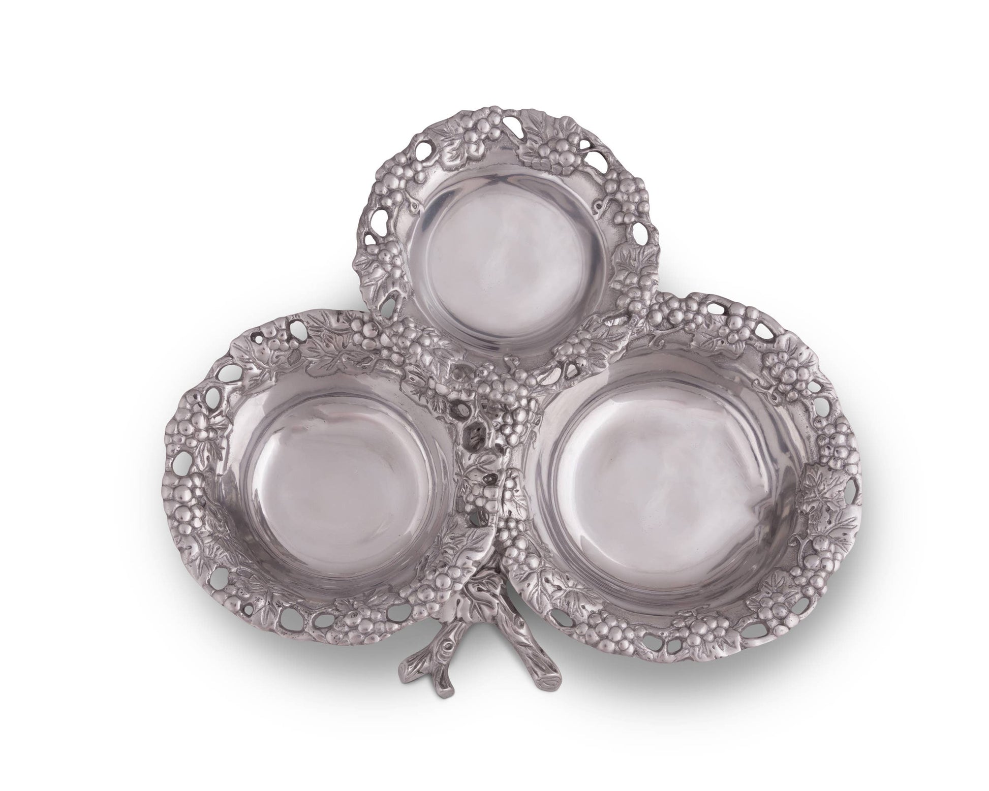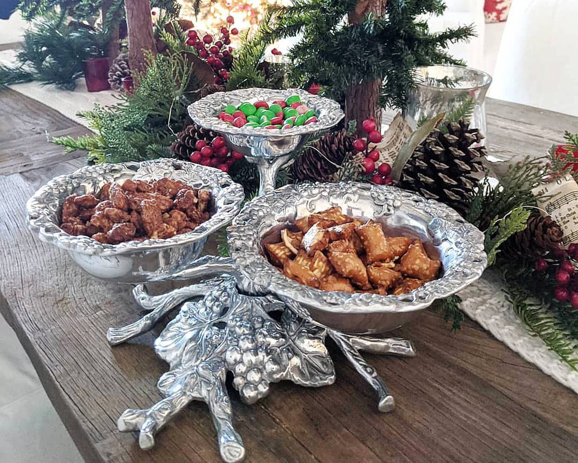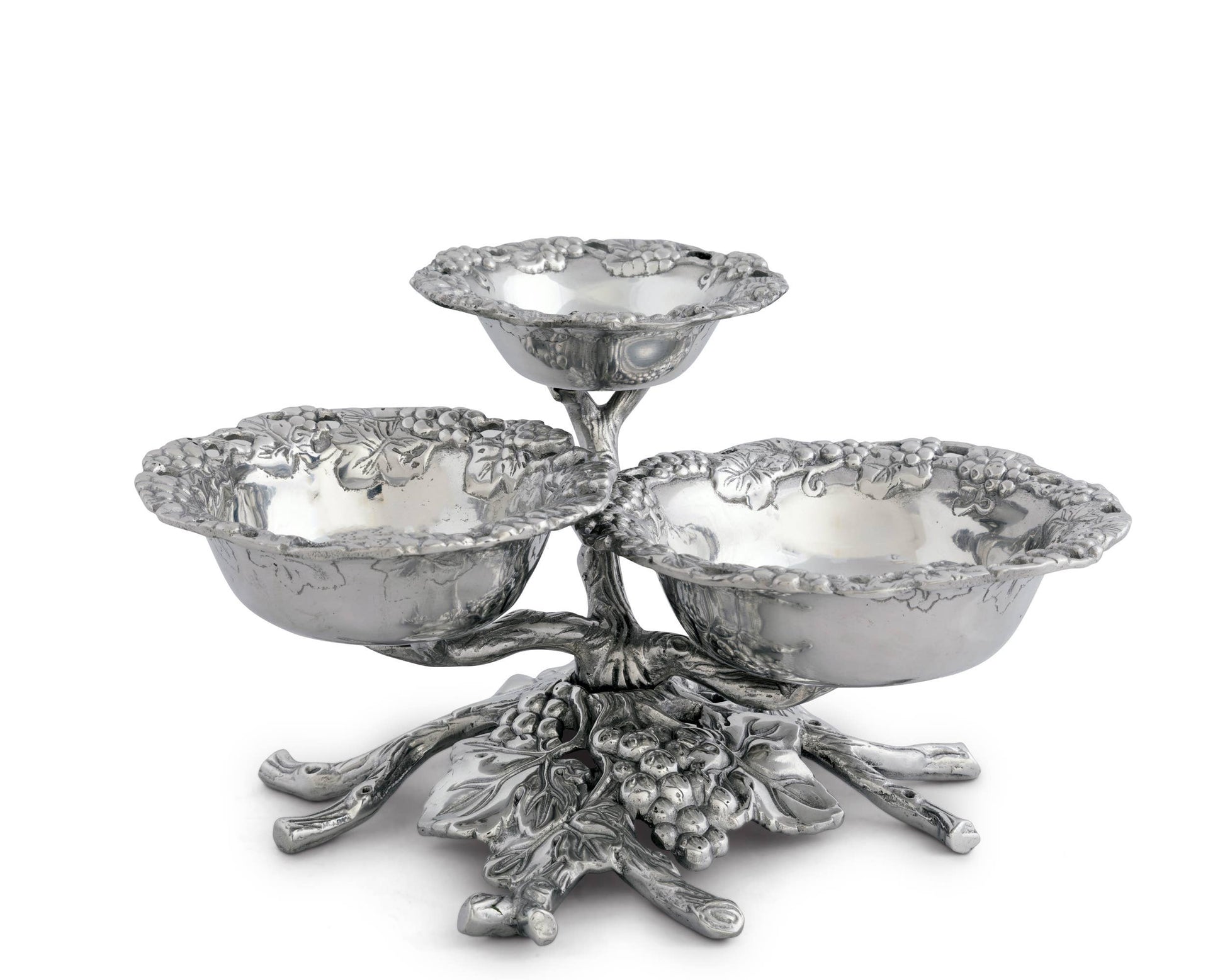 Harbor Arthur Court's tasteful 3-Tiered Grape Bowl on your table as a centerpiece or accent to serve ware. A remarkable amount of detail distinguishes this piece, highlighted by the realistic leaves and grapes at the base. Bundles of fruit and foliage also litter the rim of each elevated bowl, while heavy lines within the tree-like stand give this handmade, aluminum piece even more definition. Size: W: 10.0" / H: 6.5" Care: Wash by hand with mild dish soap and dry immediately - do not put in dishwasher.