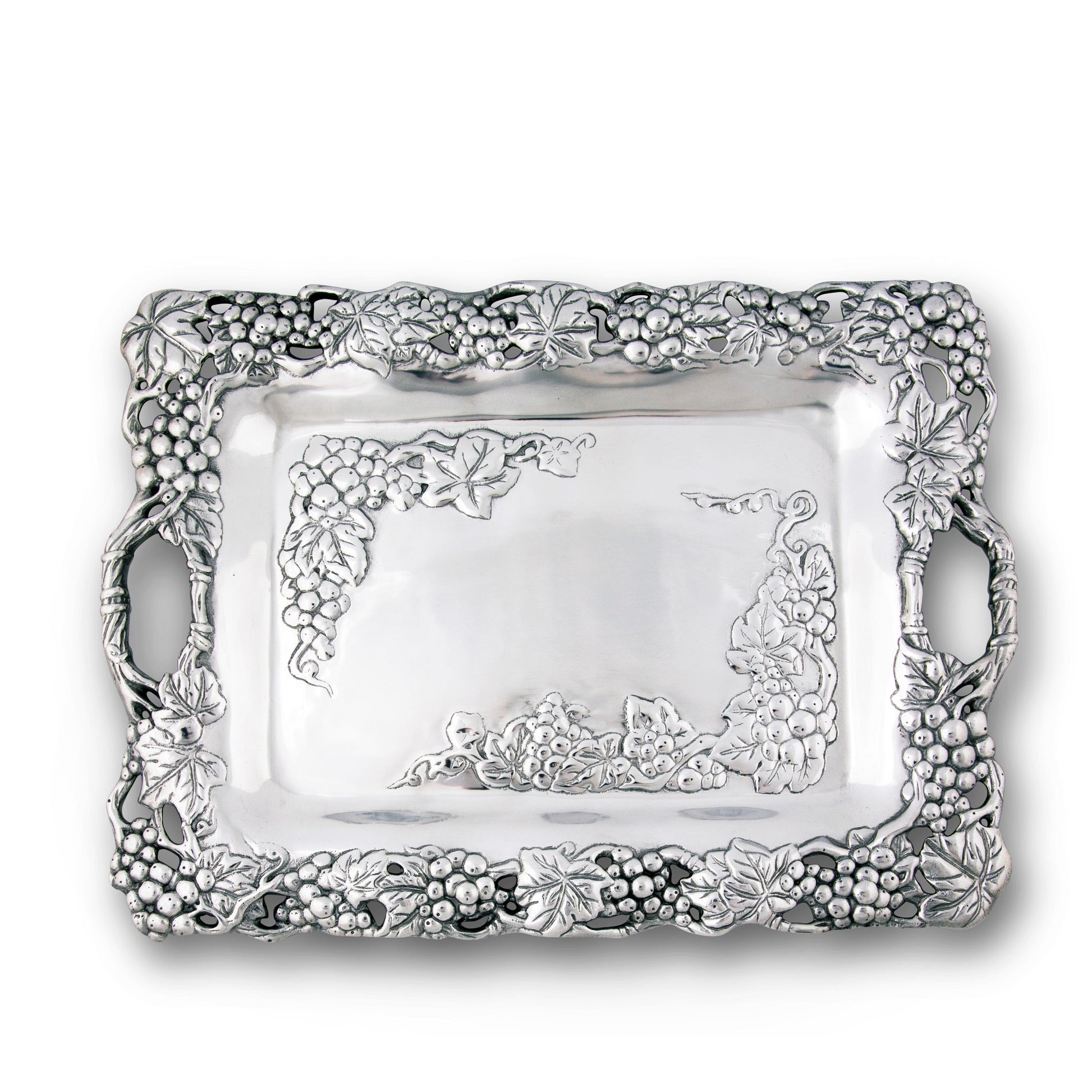 Elevate your hosting game with the Arthur Court Grape Clutch Tray: Aluminum Design for Multipurpose Use. Part of the esteemed Arthur Court Grape Collection, this Aluminium Clutch Tray is an exquisite companion for brunch hosting. Exquisitely detailed, this piece from Arthur Court captures the timeless allure of grapevine motifs. Made from alluring aluminum, this tray is not just about its looks—it's a feat of craftsmanship. Clocking in with its generous dimensions, it's quite the versatile piece, perfect for showcasing an assortment of appetizers, desserts, and much more. If you're seeking a unique anniversary gift, consider Arthur Court's detailed Grape Clutch Tray—the perfect blend of beauty, durability, and versatility.