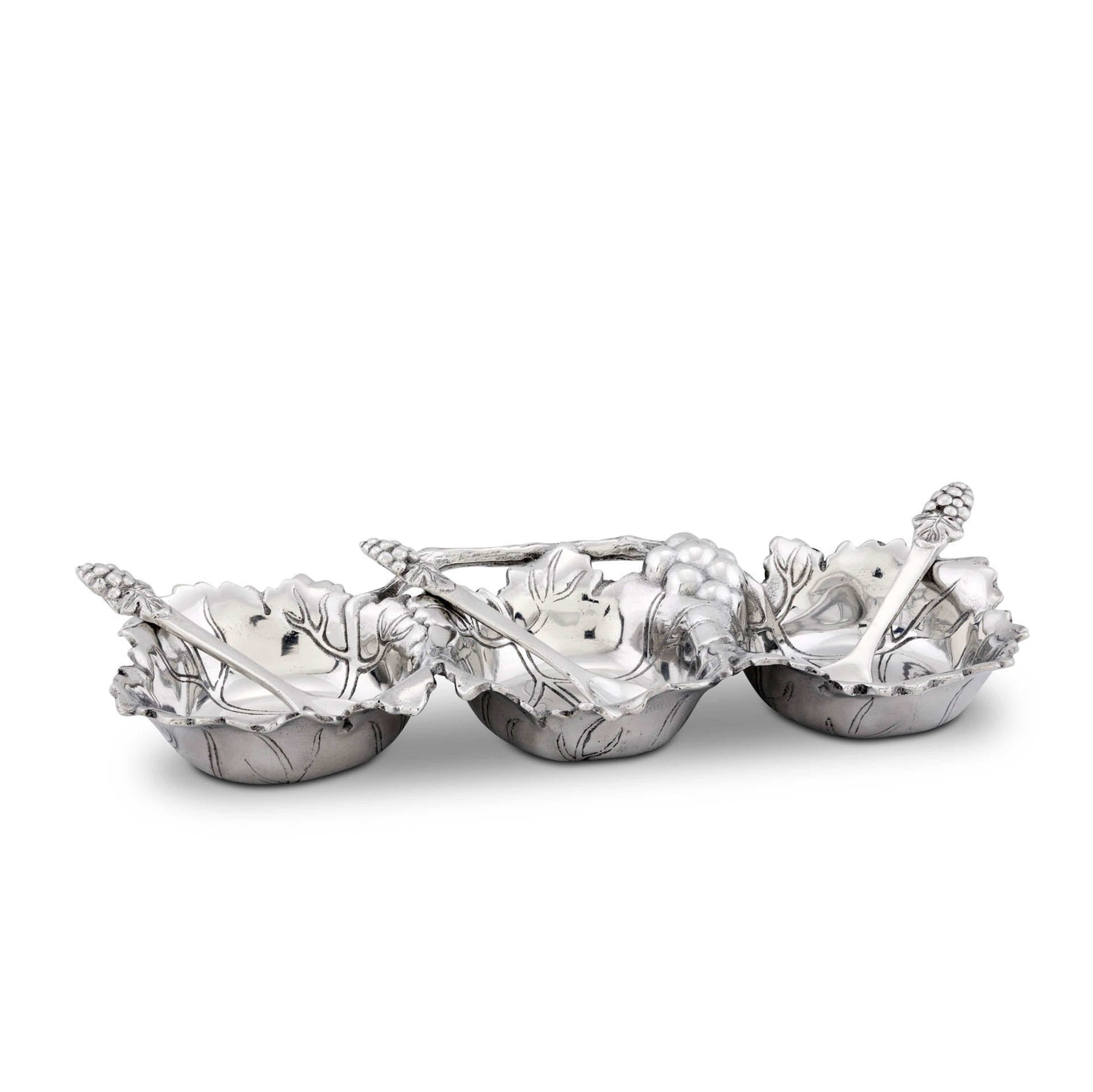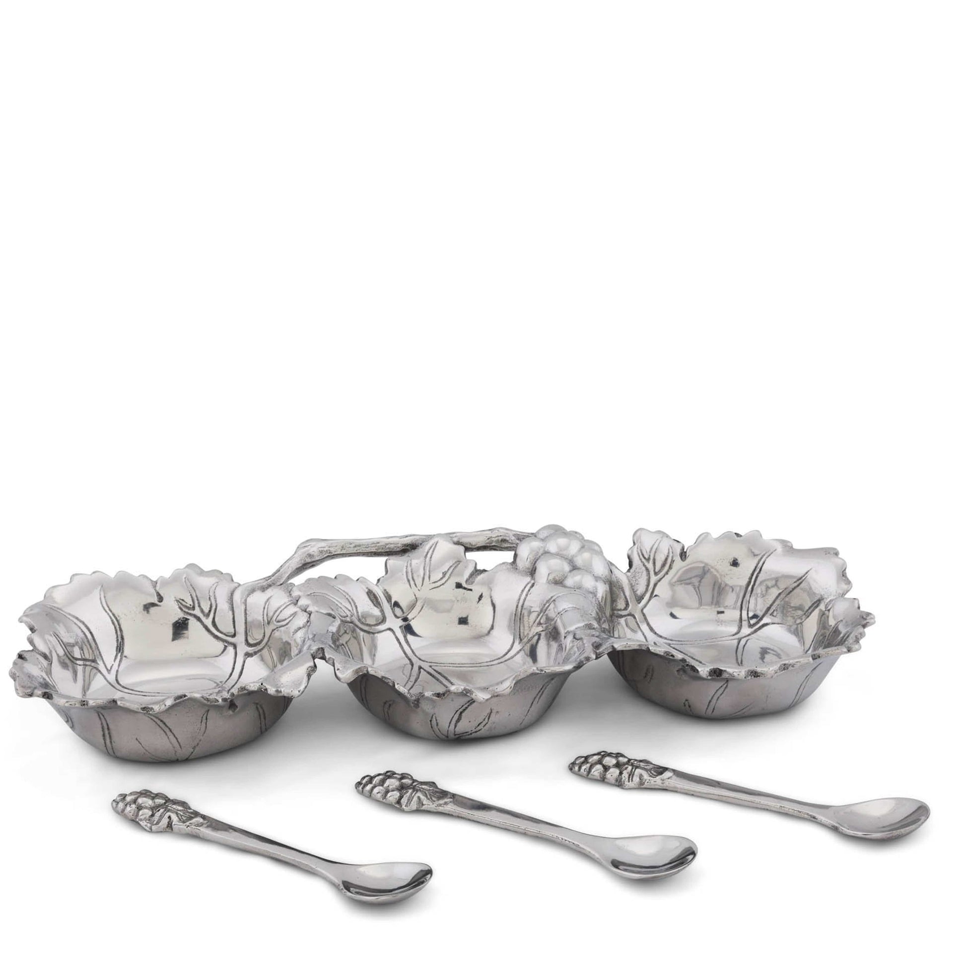 Experience the polished elegance of our Aluminum Grape Design Condiment Server for Festive Entertaining. Crafted by Arthur Court, our server is part of the Arthur Court Versatile Grape Collection for Gourmet Hosting. With its intricate grapevine designs, this server becomes a conversation piece at any gathering. Its versatile design lets you serve everything from pickles and olives to gourmet sauces and dips. It's also a Luxurious Arthur Court Grape Condiment Server for Bridal Gift. Hand-crafted from durable, FDA-compliant aluminum, this server is as functional as it is beautiful. With ample serving space, it's the ideal addition to any festive table setup.