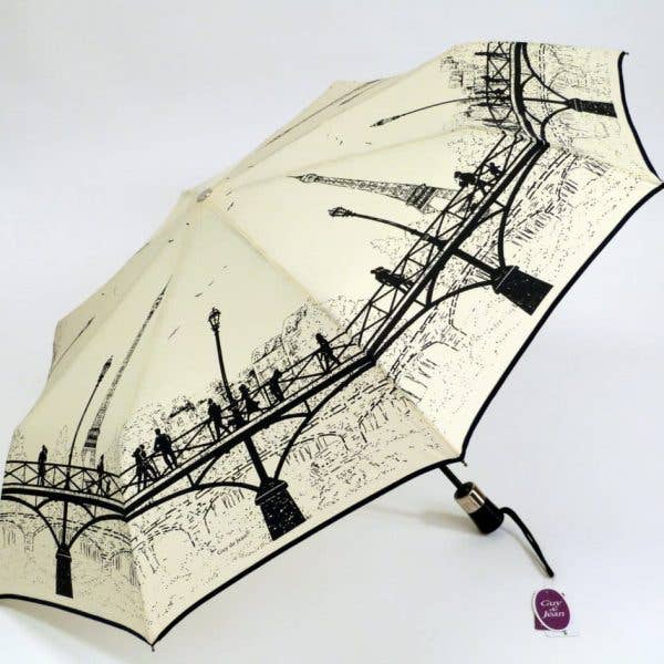 One of the bestsellers in the “Paris Guy de Jean” collection. This “Pont des Arts” folding umbrella has an automatic opening with a black wooden handle. Its covering diameter is perfect for sheltering one person. The design of this umbrella is made in our workshop in Burgundy, and the greatest care is taken during all stages of its manufacture.