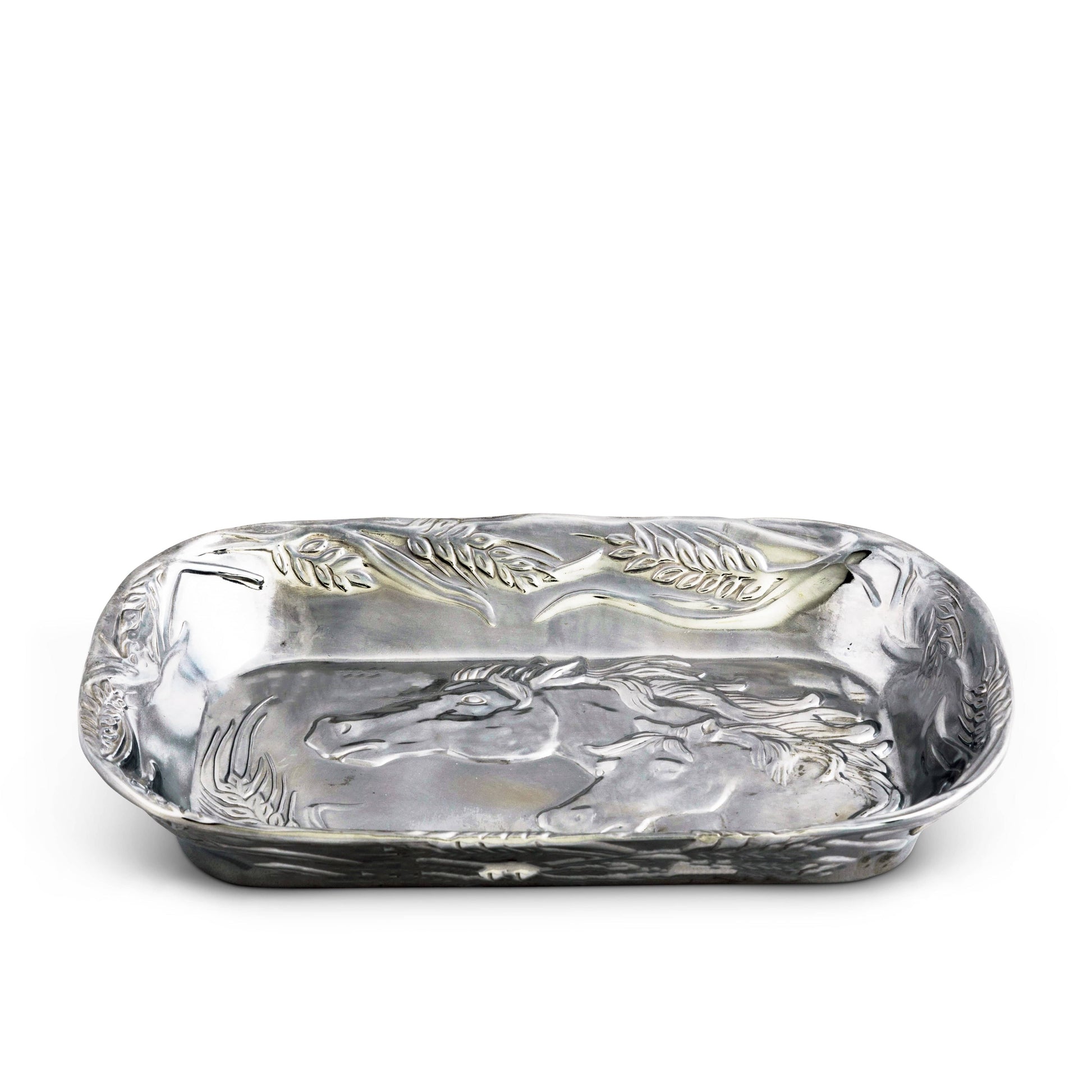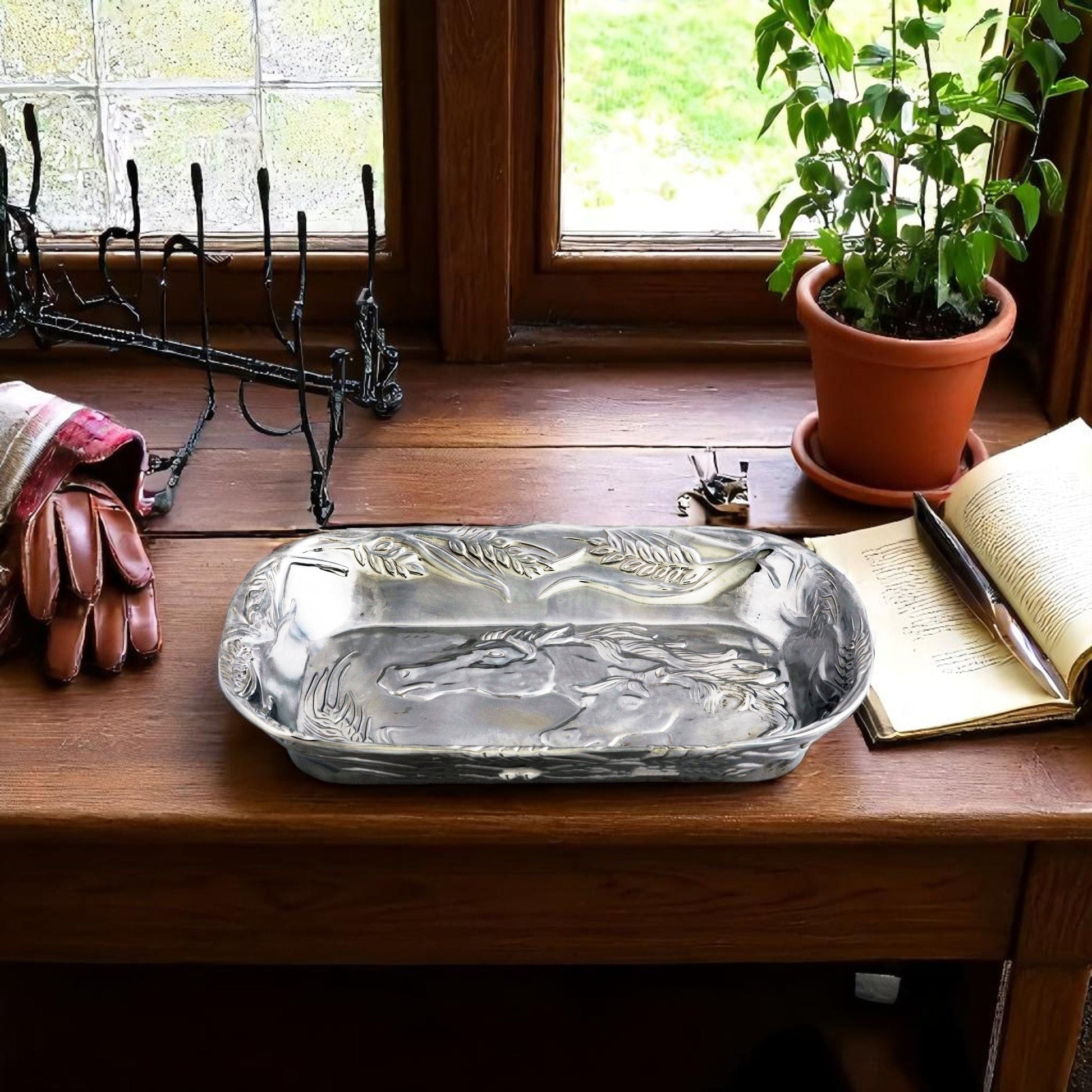Arthur Court's versatile horse catch all tray blends function with equestrian elegance. The intricately designed horse head motif and craftsmanship provide a touch of refined style, making it a unique gift idea. It's not just a horse catch all tray for horse lovers; it's a statement piece that adds personality to any space.