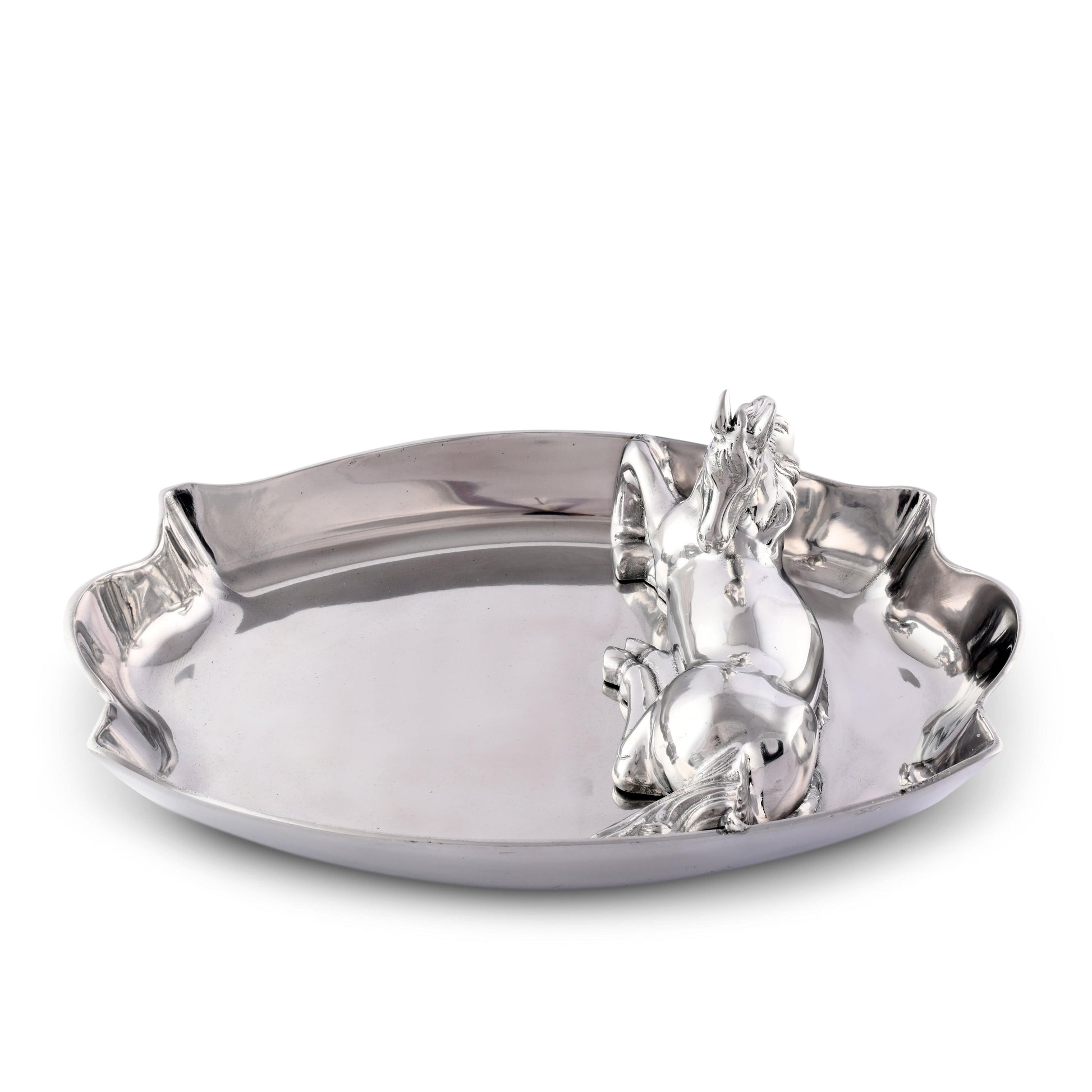 Arthur Court's horse-themed chip and dip plate: A versatile kitchen tool perfect for parties embodying style, functionality, and elegance. This antique-styled centerpiece represents excellent craftsmanship and intricate horse figural design. Perfect for social gatherings, it easily becomes the talk of the party with its impressive dimensions and versatility. A gift to remember - Arthur Court's horse figural chip and dip plate can be an ideal wedding gift. Each Arthur Court's piece is handmade with a brilliant luster that requires not polishing. Enjoy every gathering with this beautiful and unique piece.