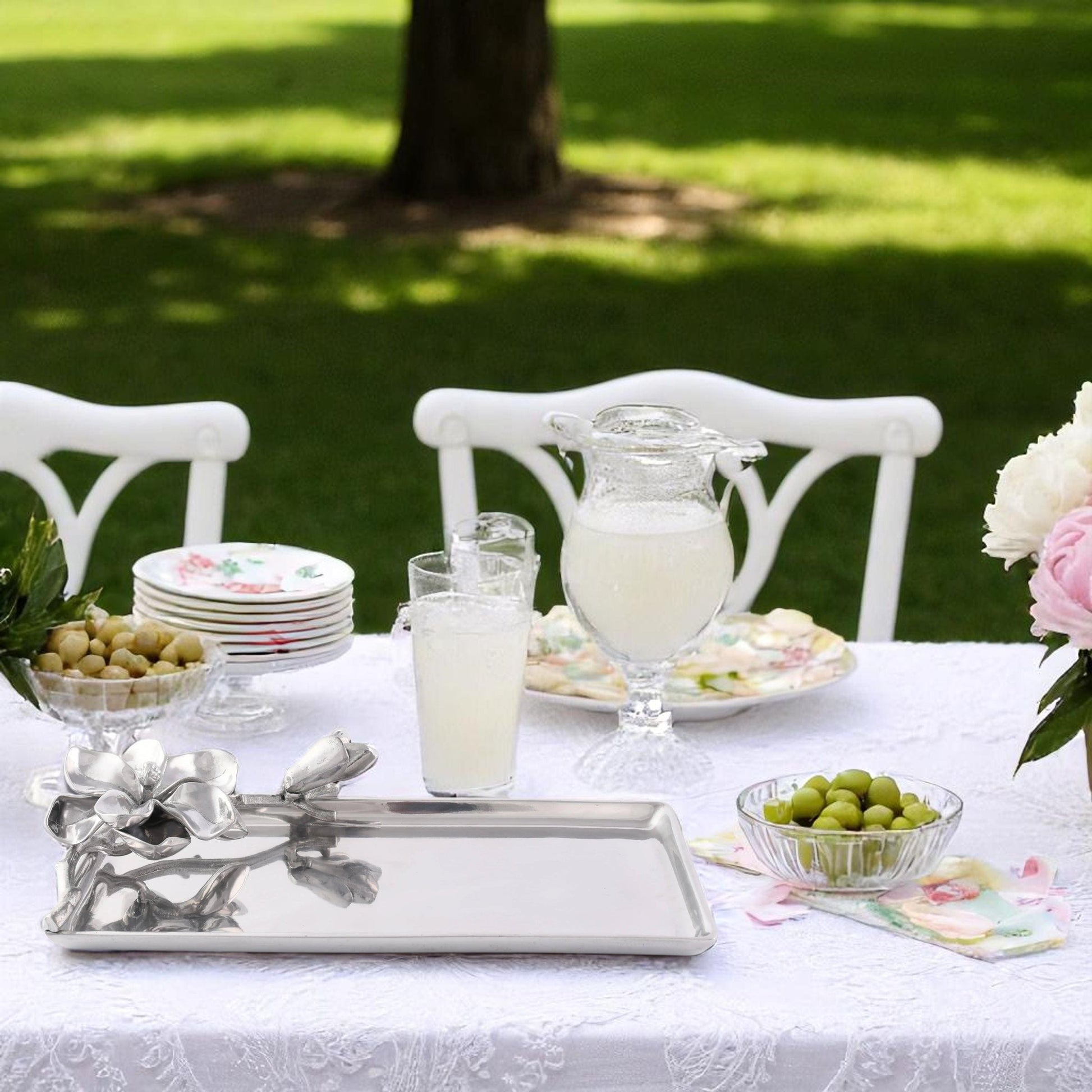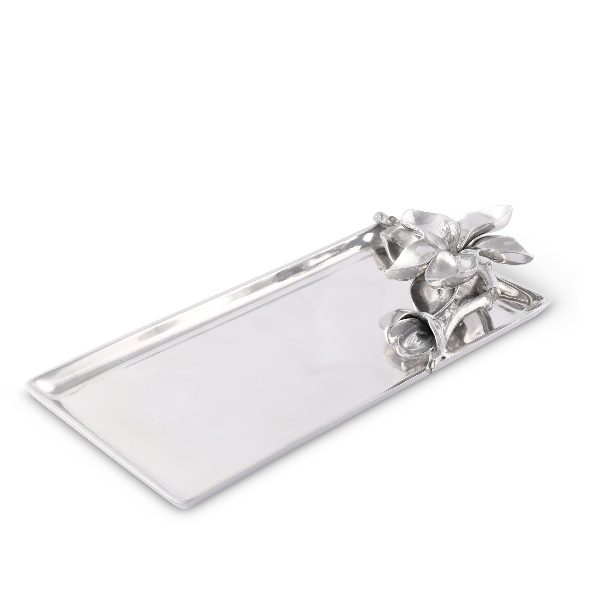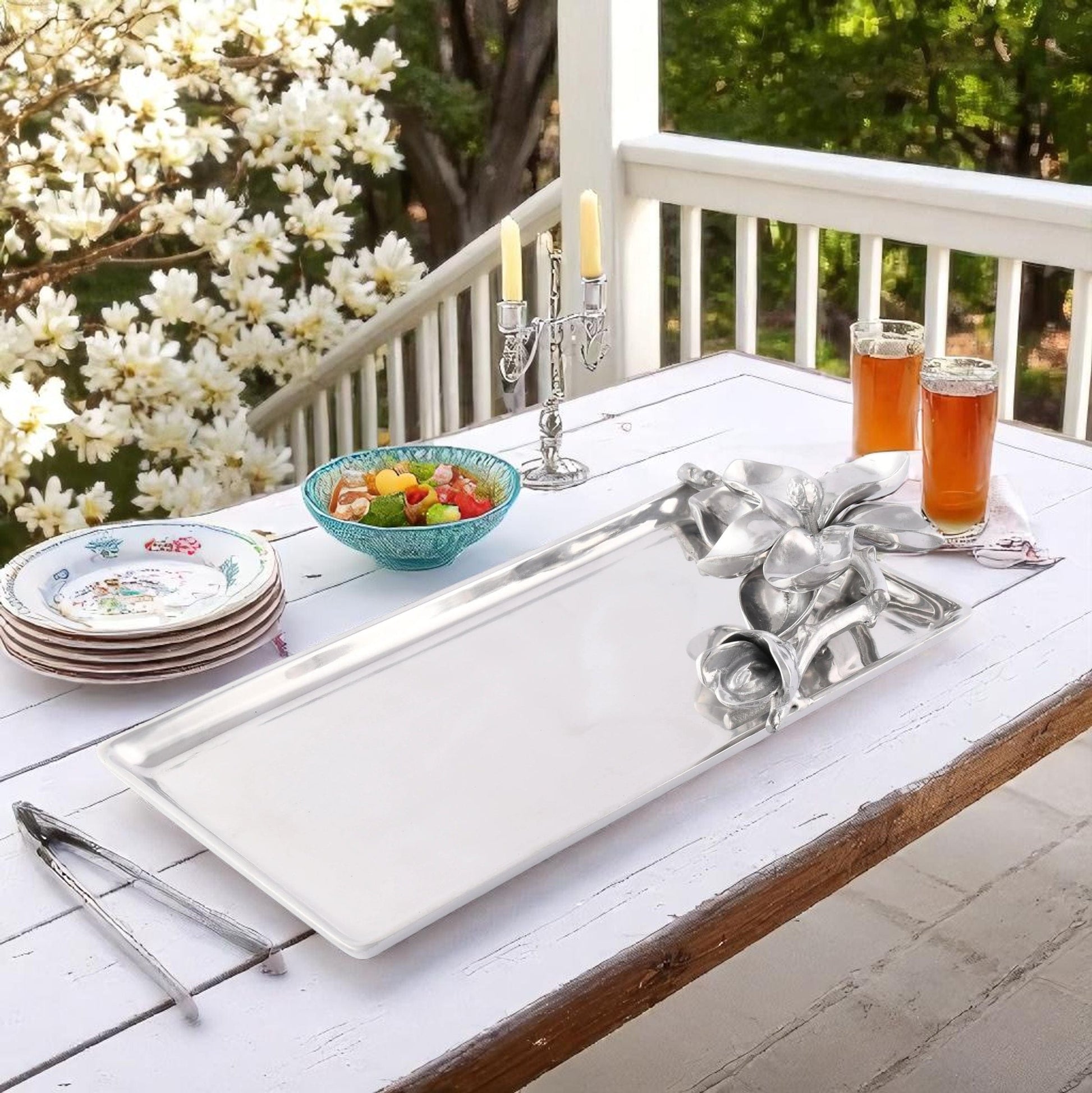 Add elegance to your humble abode with the Floral Design Aluminum Magnolia Tray for Decorative Display. This Magnolia-Themed Tray is Ideal for Dinner Parties or just to add that extra flair to your home decor. The astounding attention to detail on this tray guarantees beauty from every angle. Made from luxurious aluminum, it glows with a unique, silvery gleam. As a Perfect Entertaining Accessory with Flora Collection Magnolia Tray, it is suitable for a variety of occasions. Whether for serving guests or displaying decorative items, this tray's versatility makes it a must-have item for your home.