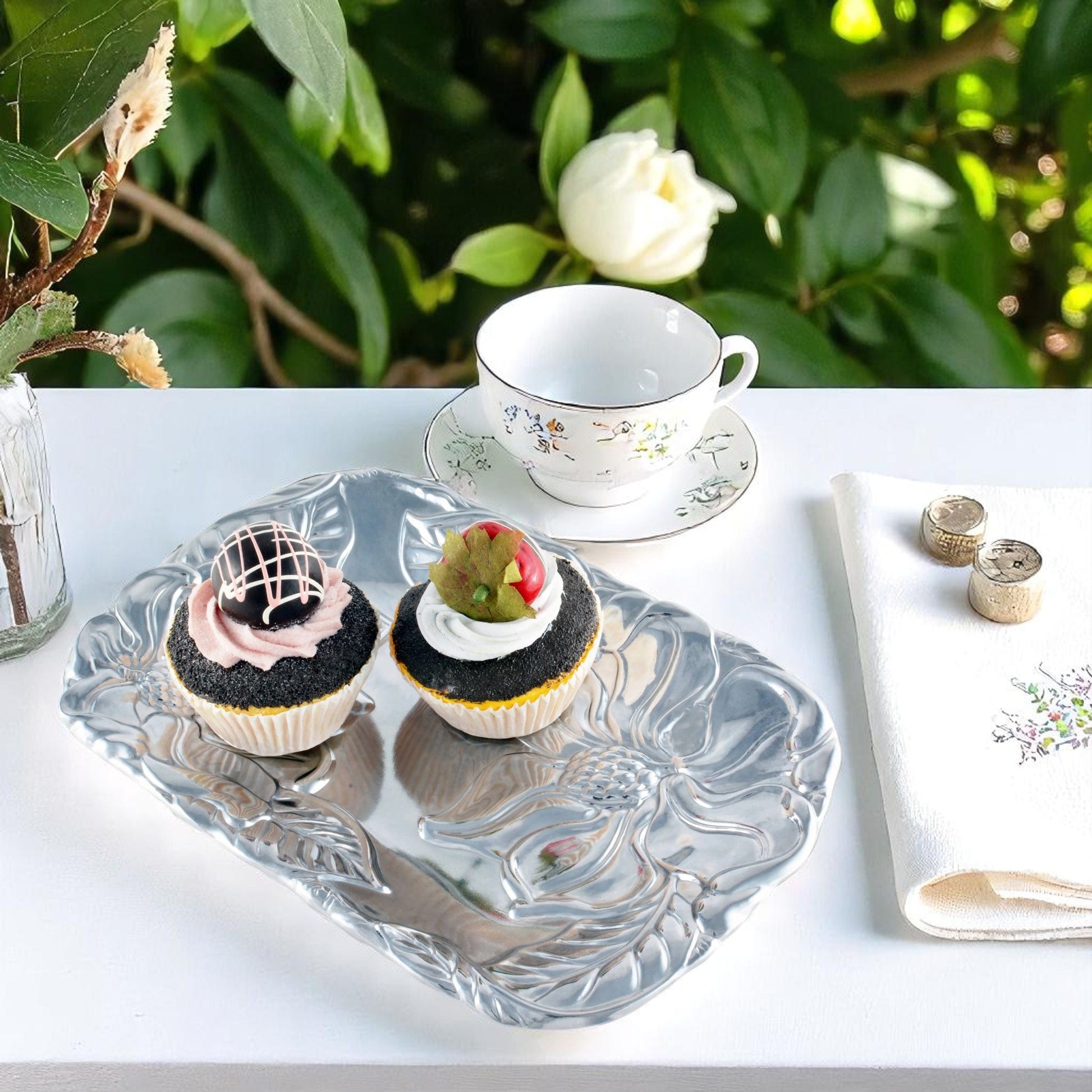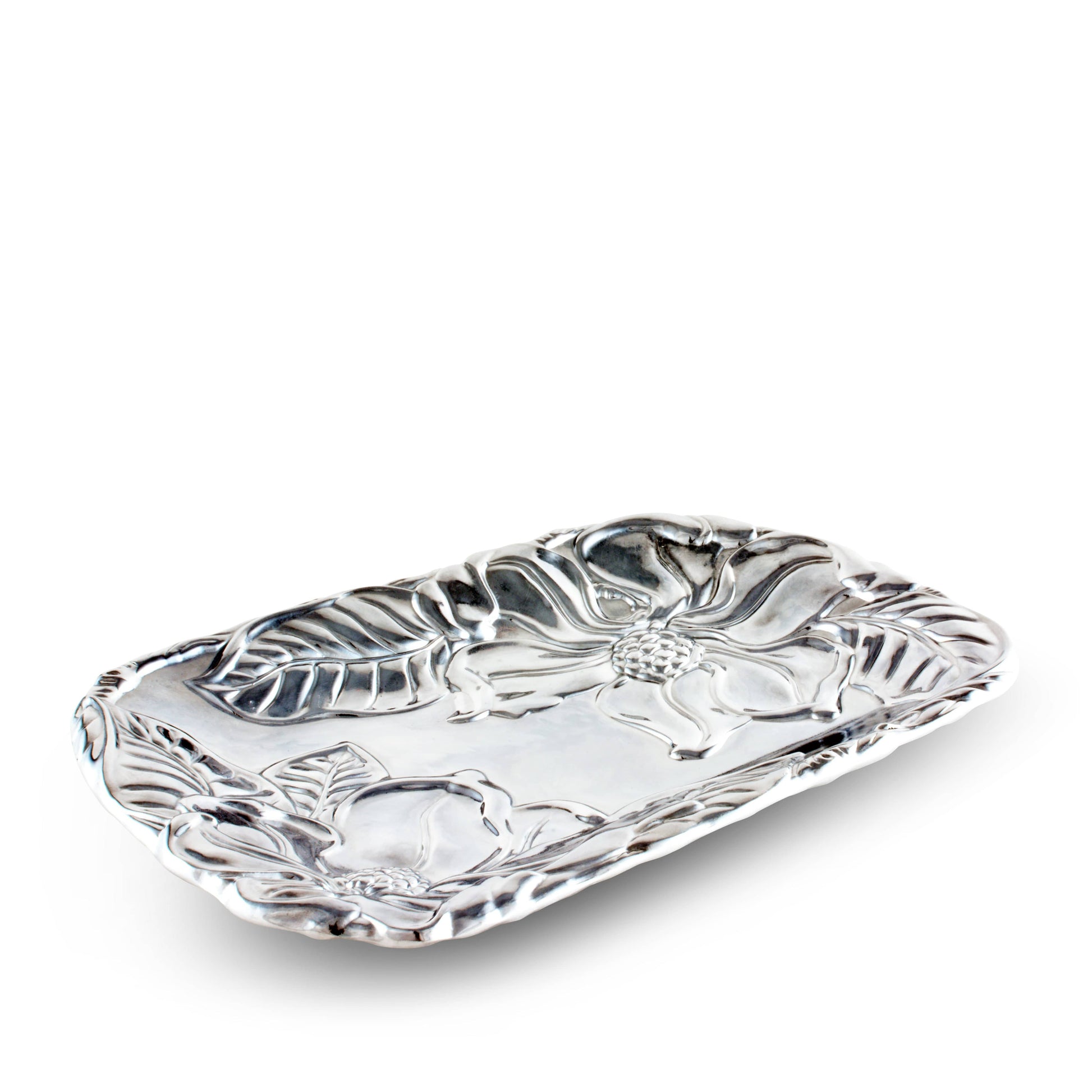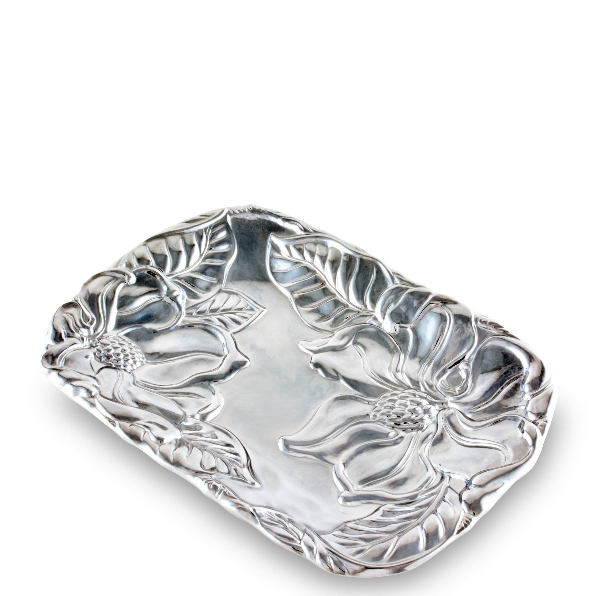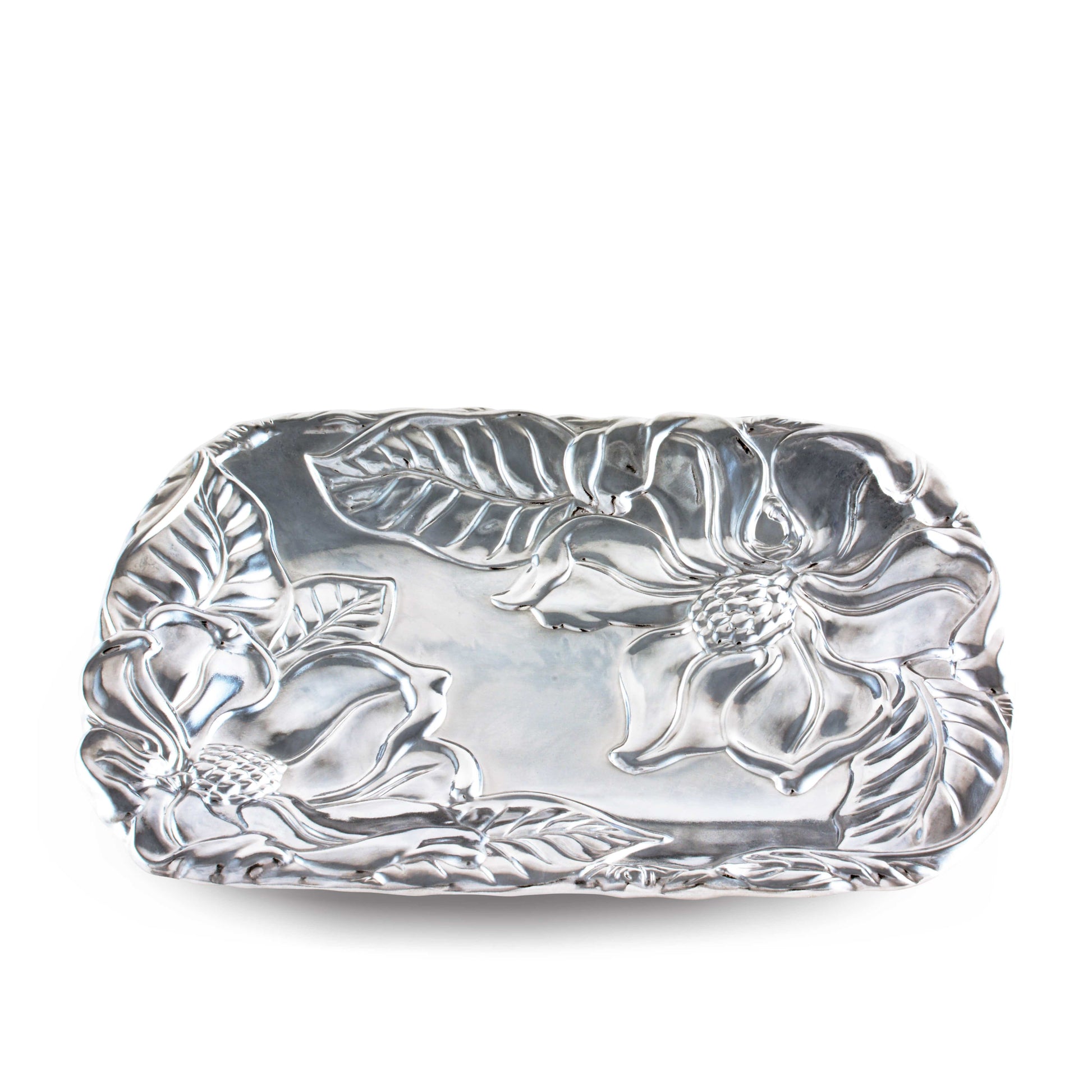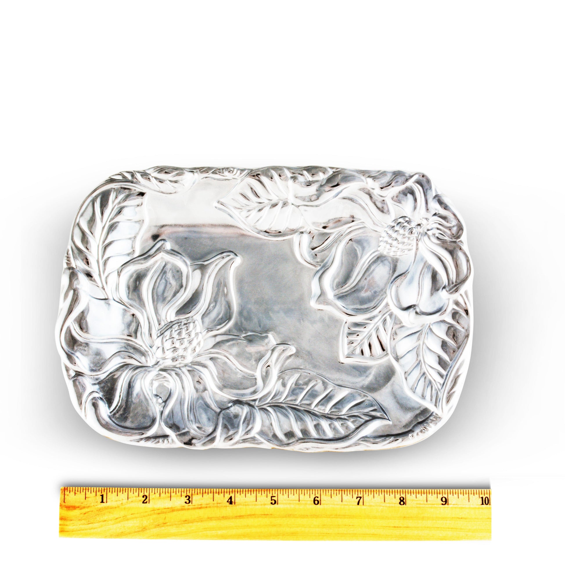 Introducing the Floral Aluminum Catch All - a blend of style and practicality. This Arthur Court creation offers a handy solution for organizing your space without compromise on aesthetics. Its enchanting magnolia design will court the fancy of any home decor enthusiast. Not only it is a perfect addition to your own decor, it's also a thoughtful gift for those who appreciate beautiful yet functional objects.