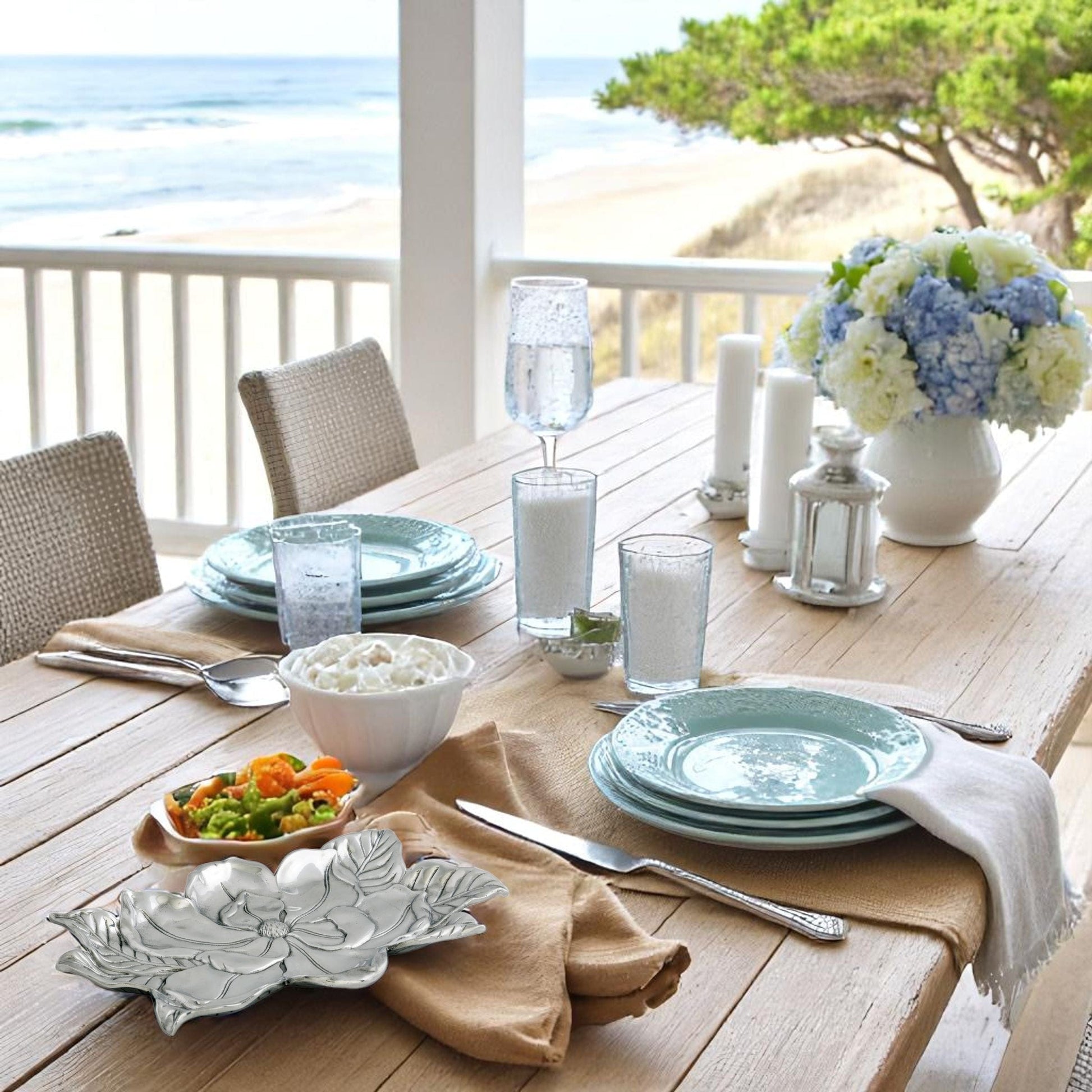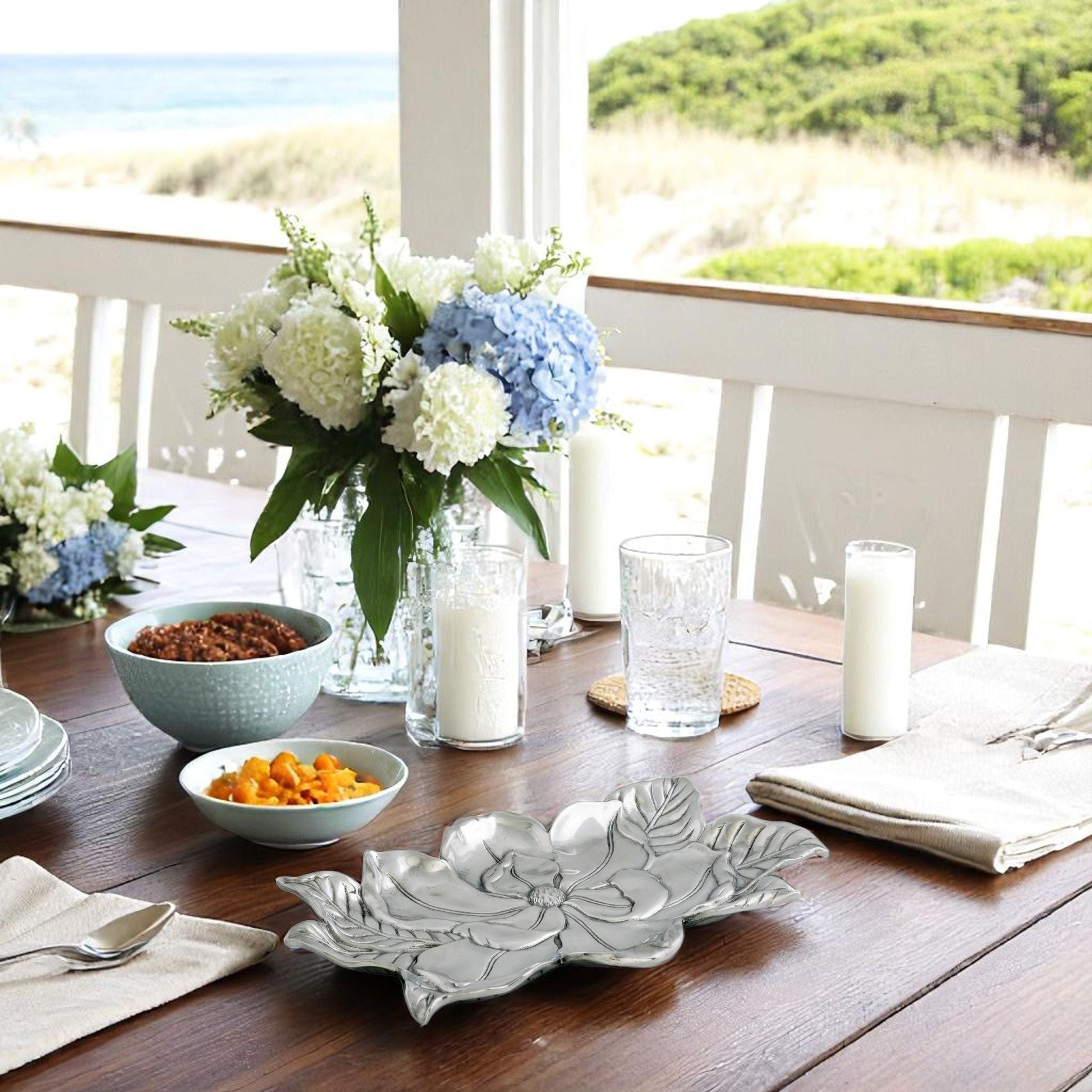 Introducing Arthur Court's Versatile Magnolia Tray - a perfect gift for the home entertaining enthusiast. Part of the high-quality Arthur Court Flora Collection, this unique serving tray adds an elegant touch to any gathering. Each tray is beautifully crafted with attention to detail, showcasing delicate magnolia blooms against a rugged, hand-polished aluminum surface for a striking contrast. Use it to serve appetizers, desserts, or as a centerpiece. It's an exceptional hostess gift that speaks volumes about your impeccable taste.