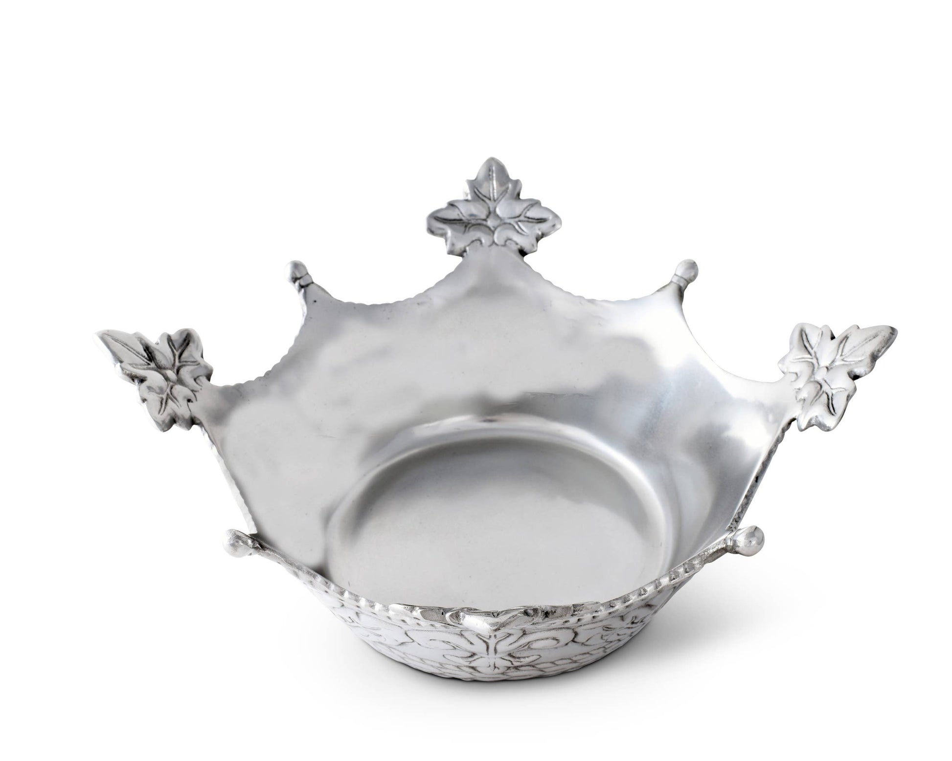 Gorgeous leaf motifs alternate between rounded points at the top of this piece, while a beaded pattern sweeps along its curved edges. Fleur-de-lis symbols accompany more leaf designs around the sides as a ropy pattern circles the base of this handmade, aluminum bowl.