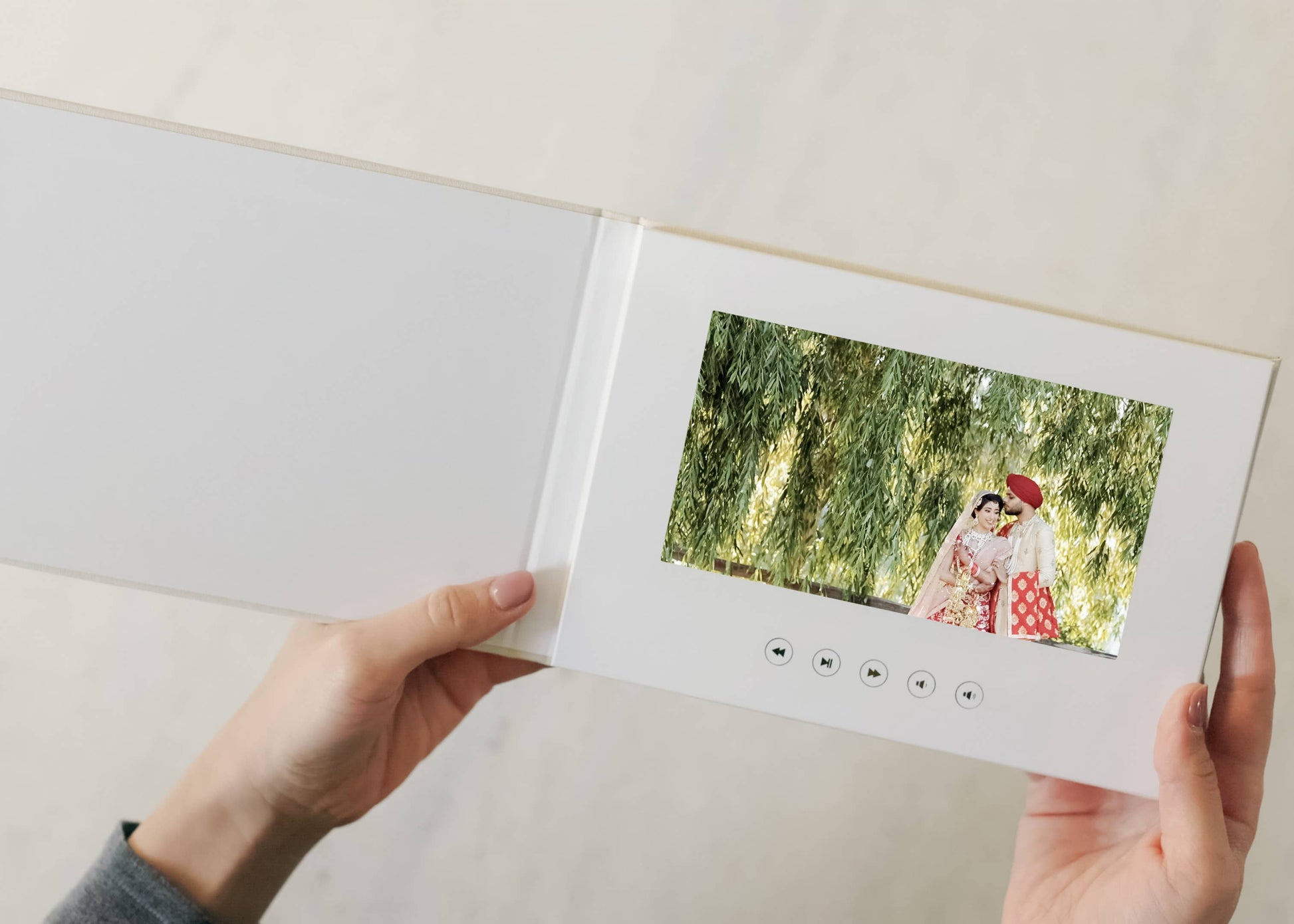 The "Memories" Motion Books are the new way to store and watch your videos or slideshows from your favorite life memories. It’s easy to use and always ready to play! Crafted with care, the LINEN bound wedding video album sure won't disappoint. Open the cover and your videos play automatically on the gorgeous 7″ IPS display. With 4GB of memory, it’s always ready to play your videos with a 2500mAh rechargeable battery that lasts about 4 hours when playing videos and over 12 months on standby. Charge and upload video files to the The Motion Books by using the provided micro-USB cable. The timeless linen design elevates the visual and tactile experience of The Motion Books and helps it stand out on your bookshelf or your coffee table.