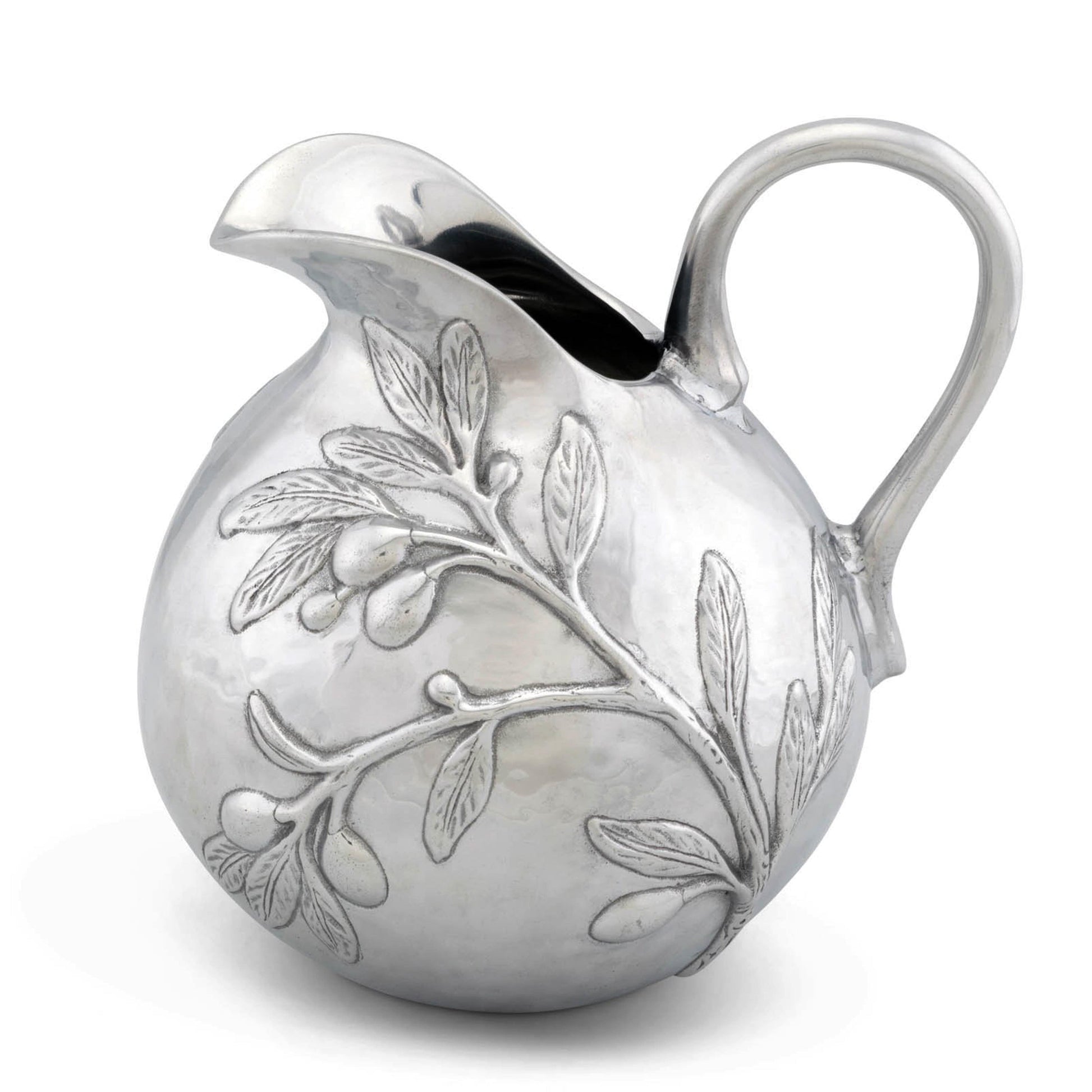 Take your hosting to the next level while transforming any gathering from ordinary to extraordinary with the Olive Grove Pitcher for Special Occasion Gifting. Crafted by Arthur Court, our Olive Grove Pitcher is more than just a useful tool - it's a statement piece. Gift idea: For a lover of high-quality barware, the Arthur Court Olive Design High-Quality Pitcher is the perfect surprise. Engraved with a beautiful olive grove design, it pays homage to the evergreen beauty of nature. Whether it's for a birthday, anniversary, or just because, the receiver will cherish this timeless piece. Each Arthur Court Olive Grove Pitcher for Special Occasion Gifting is handcrafted with food-grade aluminum and designed to keep your drinks cold longer than average pitchers due to its material. It sits at a size presentable for any occasion at 10" tall x 5-1/2" Diameter, bringing a touch of elegance to your special events.