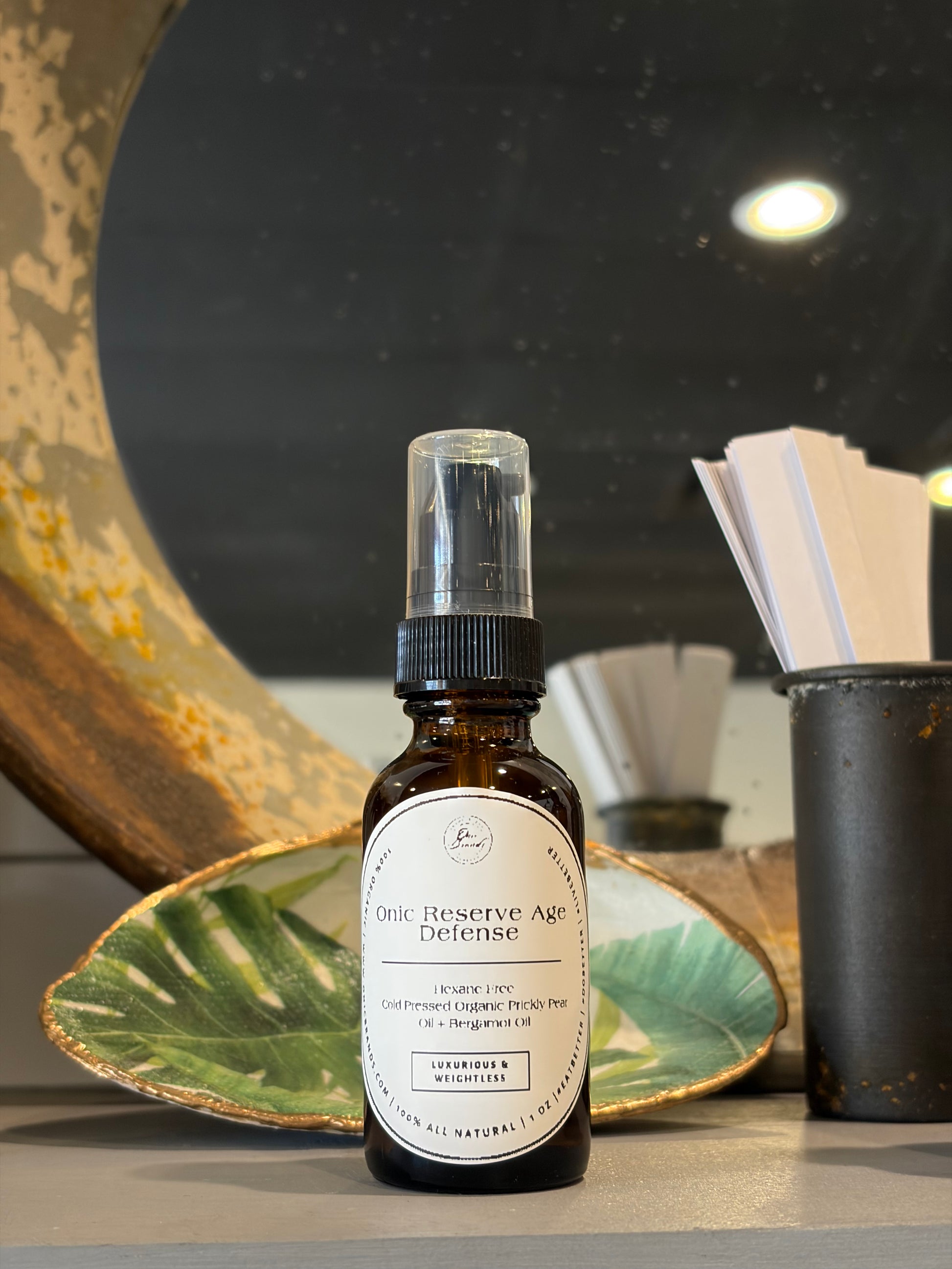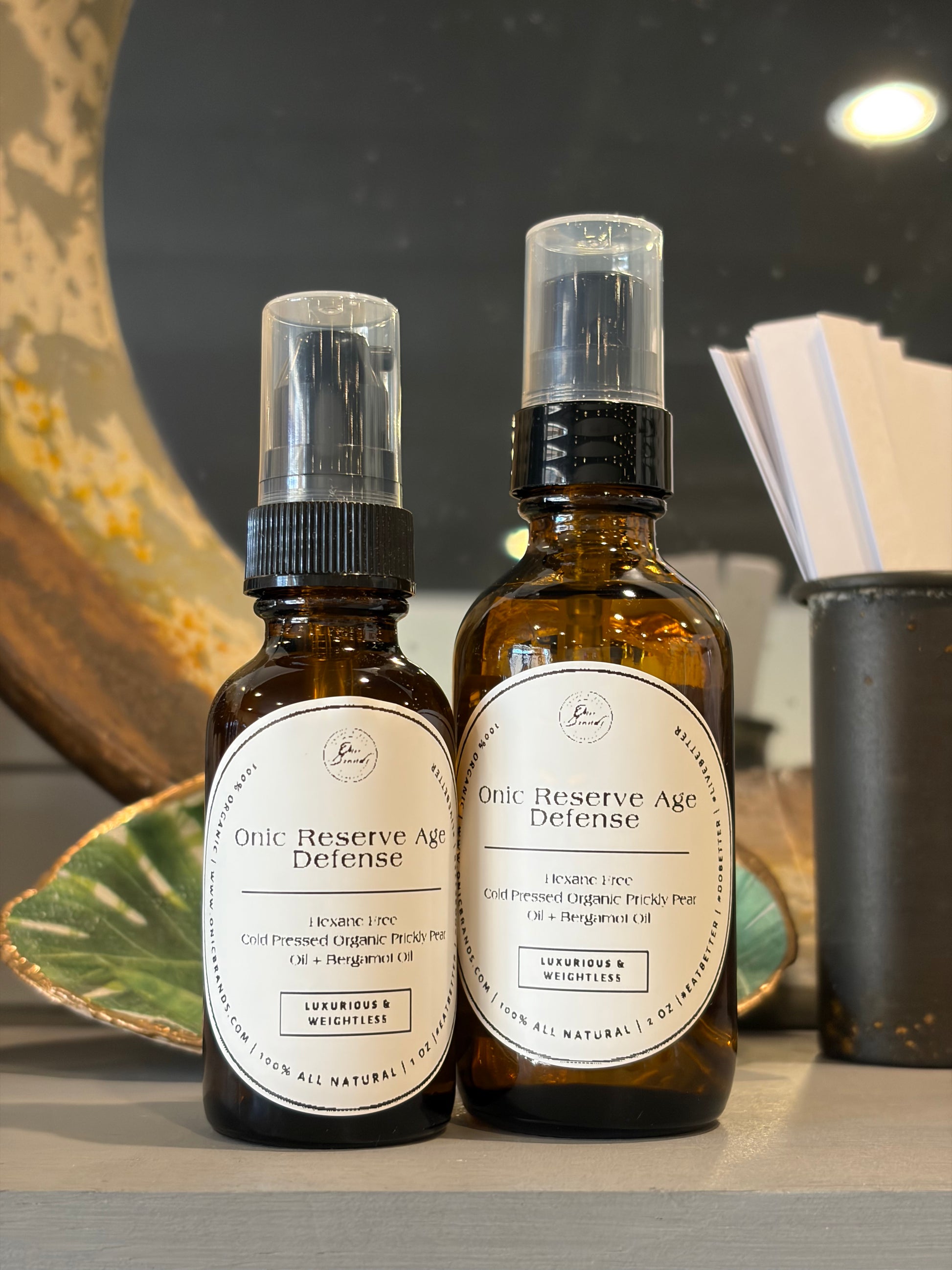 Experience the powerful secret of the desert with the Onic Reserve Age-Defense. Sourced from 100% pure, cold-pressed Prickly Pear seeds, this rare and precious oil is unmatched in its ability to smooth, brighten, and restore mature skin.