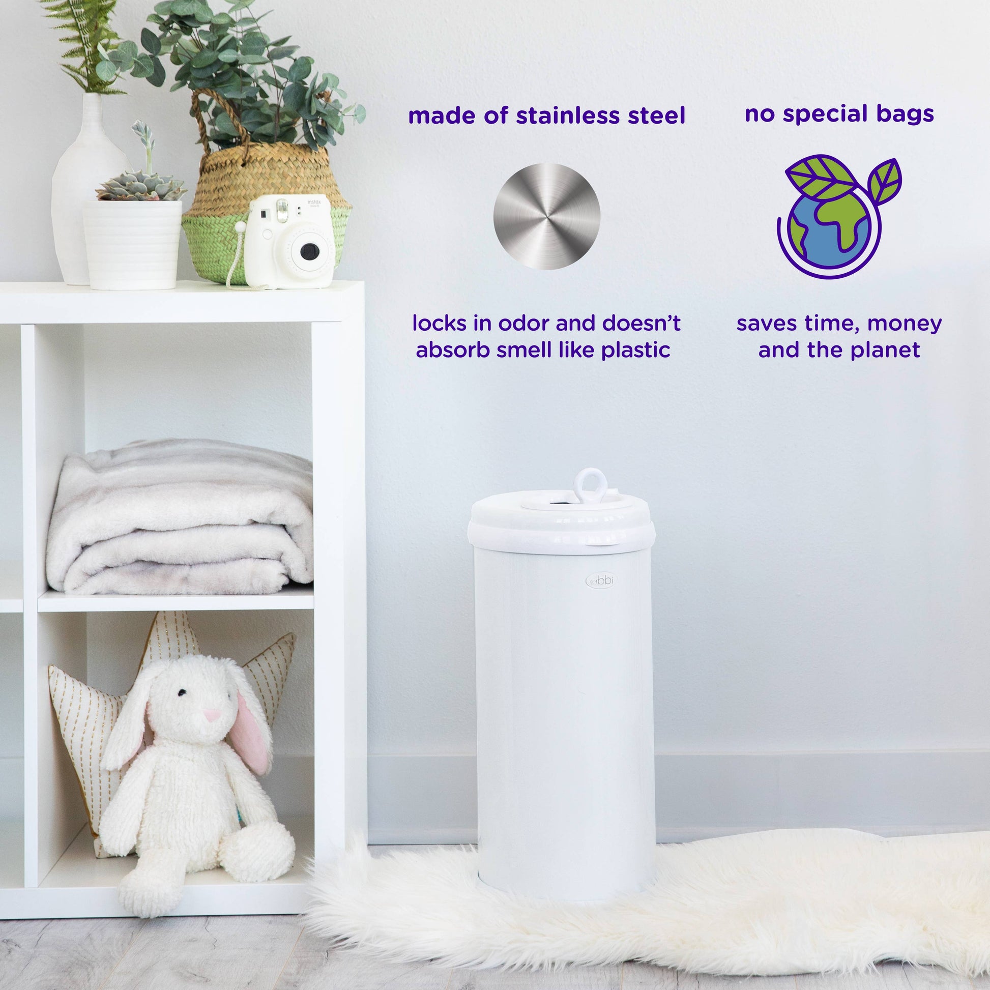 · The Ubbi Diaper Pail is made of stainless steel, which provides superior odor control compared to other materials. This high-quality steel and rubber seal design ensures that unpleasant smells are contained within the pail, keeping your nursery smelling fresh and clean.